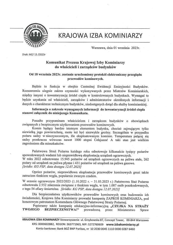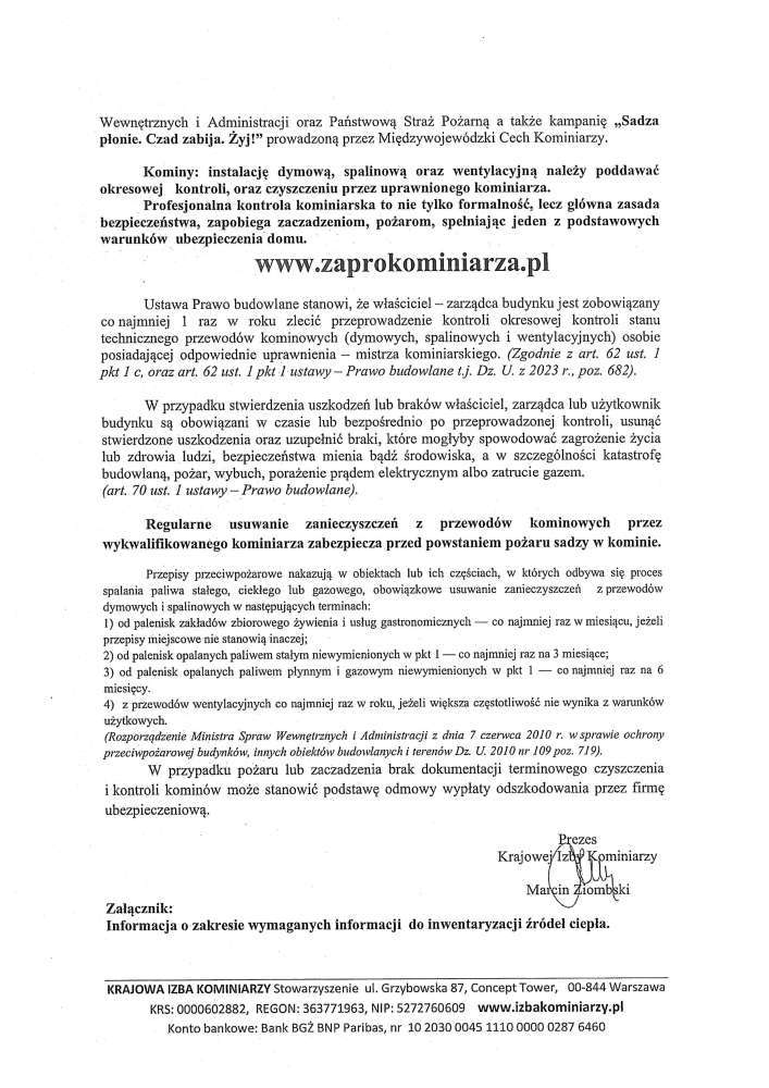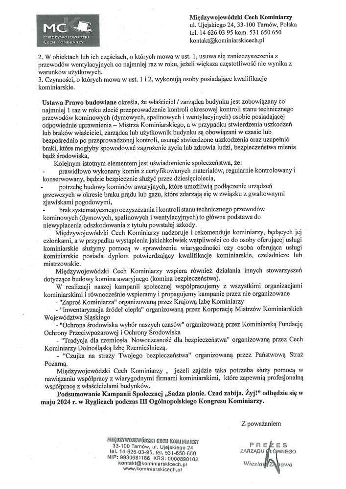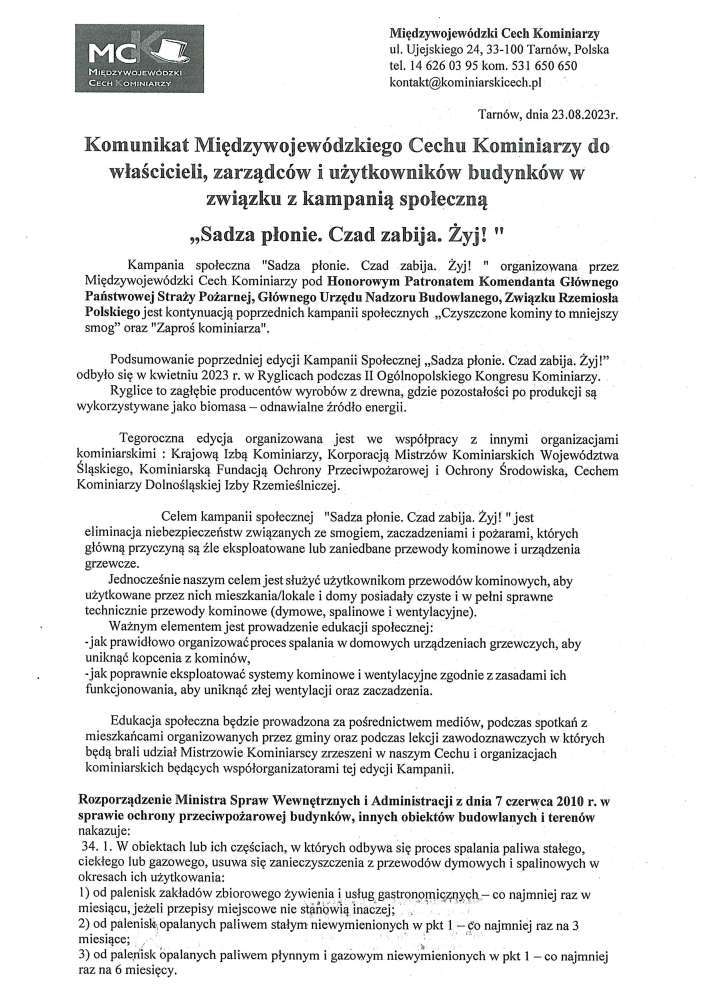 Poniżej treść komunikatu Mędzywojewódzkiego Cechu Kominiarzy dot. kampanii społecznej "Sadza płonie. Czad zabija. Żyj!"