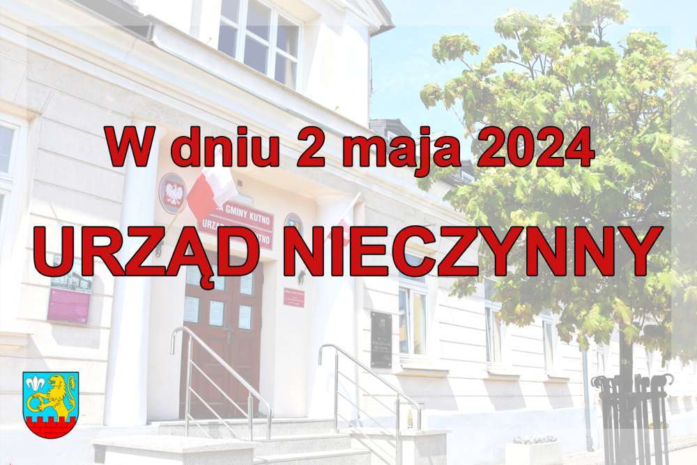 Informujemy, że w dniu 2 maja 2024 roku Urząd Gminy Kutno, Centrum Usług Wspólnych i Gminny Ośrodek Pomocy Społecznej będą nieczynne.