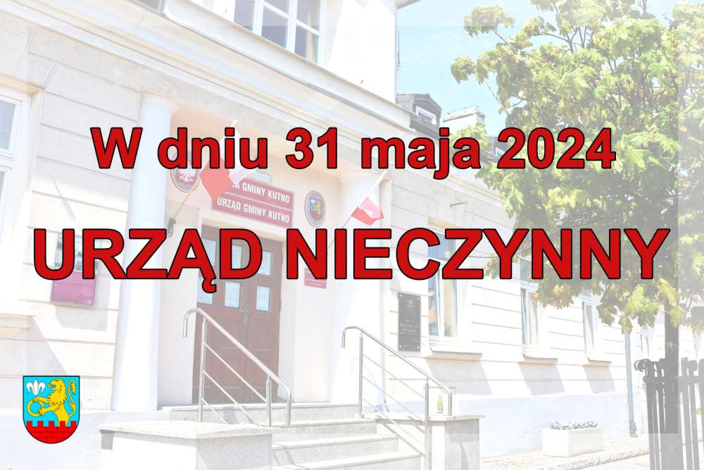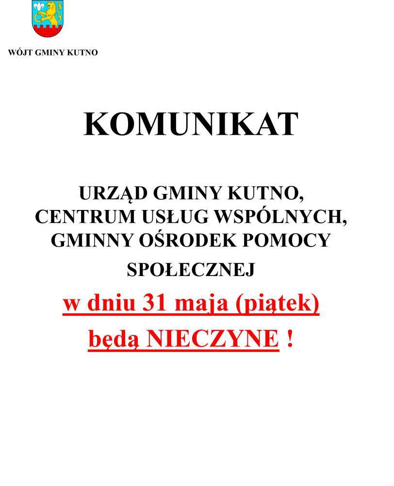 Informujemy, że w dniu 31 maja 2024 roku Urząd Gminy Kutno, Centrum Usług Wspólnych i Gminny Ośrodek Pomocy Społecznej będą nieczynne.