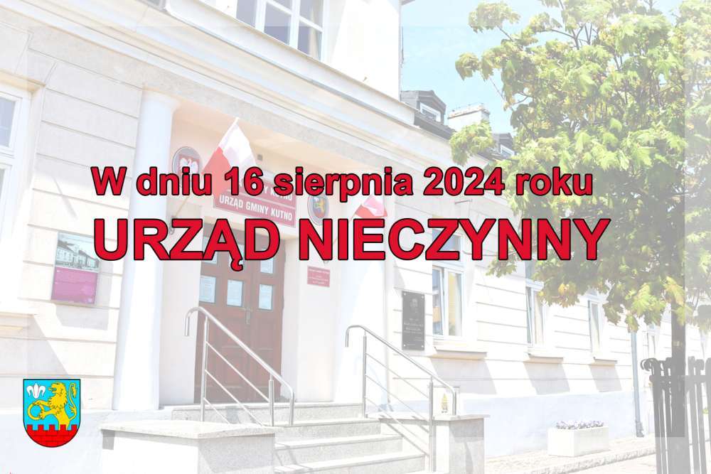 Informujemy, że w dniu 16.08.2024 roku Urząd Gminy Kutno, Gminny Ośrodek Pomocy Społecznej i Centrum Usług Wspólnych będą nieczynne.