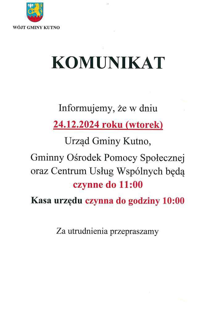 Informujemy, że w dniu 24.12.2024 roku (wtorek) Urząd Gminy Kutno, Gminny Ośrodek Pomocy Społecznej i Centrum Usług Wspólnych będą czynne w godzinach 7:30 -11:00. Kasa urzędu będzie otwarta do godziny 10:00.