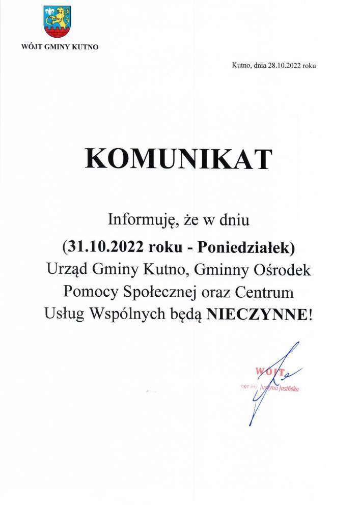 Poniżej komunikat Wójt gminy Kutno Justyny Jasińskiej.