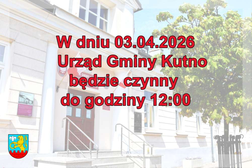 Informujemy, że w dniu 03.04.2026 roku Urząd Gminy Kutno, Gminny Ośrodek Pomocy Społecznej i Centrum Usług Wspólnych będą czynne do godziny 12:00. Kasa urzędu będzie otwarta do godziny 11:00.
