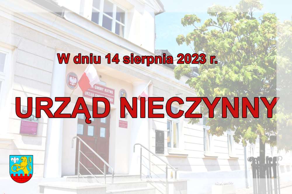 Informujemy, że w dniu 14 sierpnia 2023 roku Urząd Gminy Kutno, Centrum Usług Wspólnych i Gminny Ośrodek Pomocy Społecznej będą nieczynne.