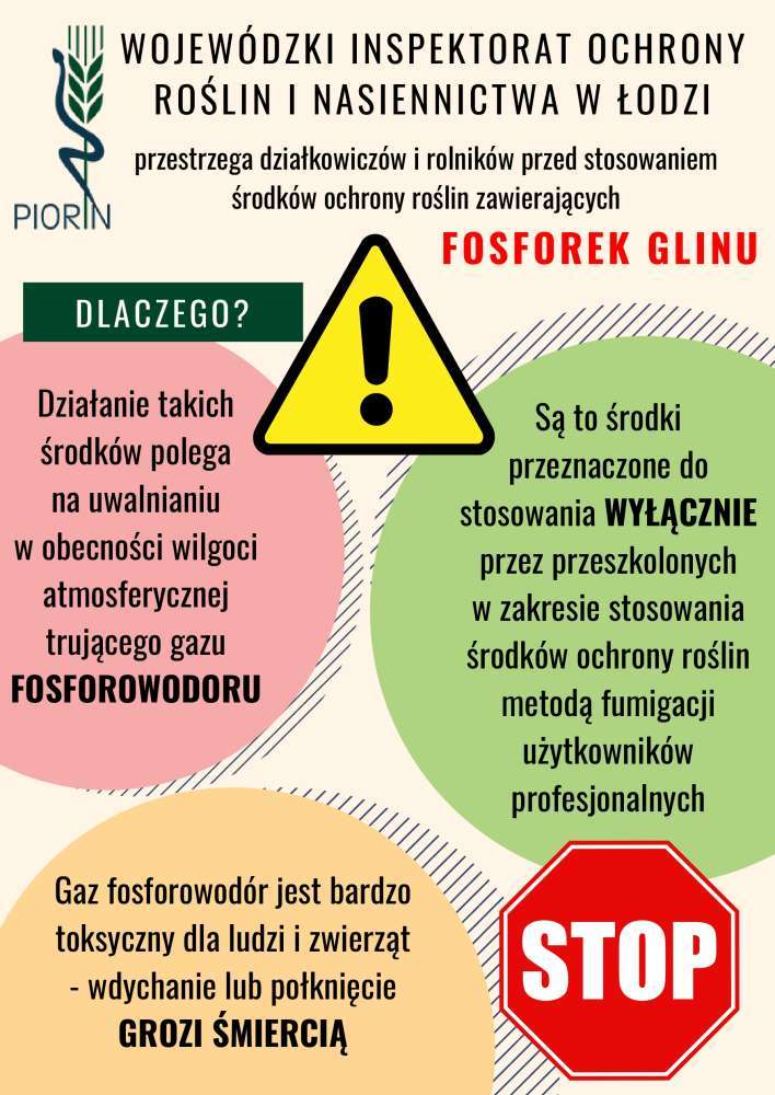 Łódzki Wojewódzki Inspektor Ochrony Roślin i Nasiennictwa w Łodzi przestrzega przed stosowaniem środków ochrony roślin zawierających substancję czynną fosforek glinu: Quickphos Tablets 56 GE, Quickphos Pellets 56 GE, Quickphos Bags, Quphos Pellets 56 GE, Phostoxin Tablet, Phostoxin Bag, Phostoxin Tablet, Morta, Masterphos Tabletki 56 GE, Masterphos Peletki 56 GE, Greenphos Tablets, Greenphos Pellets 56 GE, Greenphos Pellets Proffesional 99 GE, Greenphos, Greenphos Pellets Expert 100 GE, Greenphos Pellets Professional 99,3 GE, Greenphos Pellets Professional 99,2 GE, Greenphos Pellets Professional 99,1 GE, APS, APS Peletki, APS Tabletki, Delicia Gastoxin, Sobieski 56T, Sobieski 56P, Fumiphos.