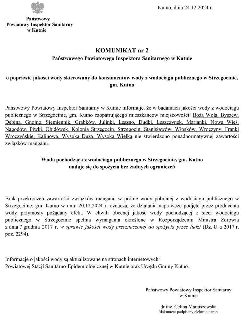 Poniżej treść komunikatu Państwowego Powiatowego Inspektora Sanitarnego w Kutnie dot. poprawy jakości wody.