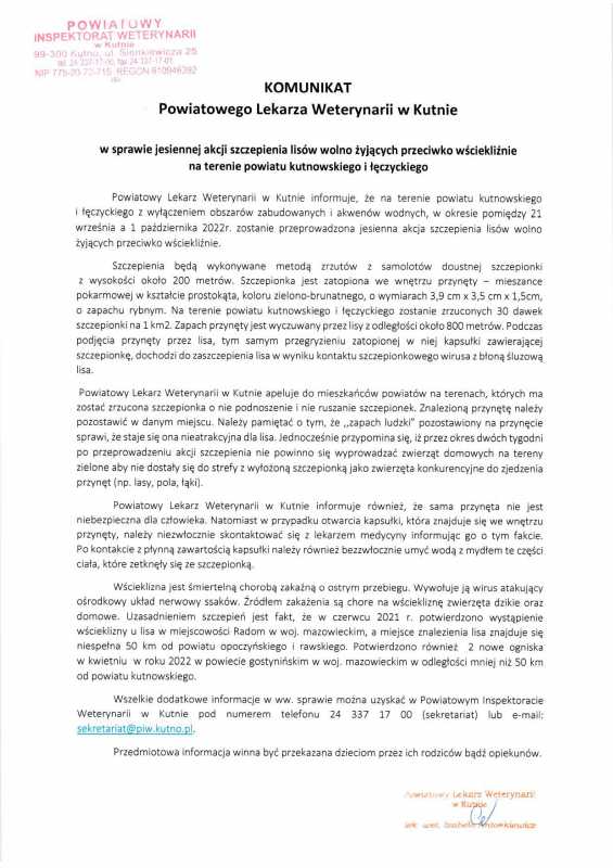 Poniżej treść komunikatu Powiatowego Lekarza Weterynarii w Kutnie w sprawie akcji szczepienia lisów wolno żyjących przeciwko wściekliźnie.