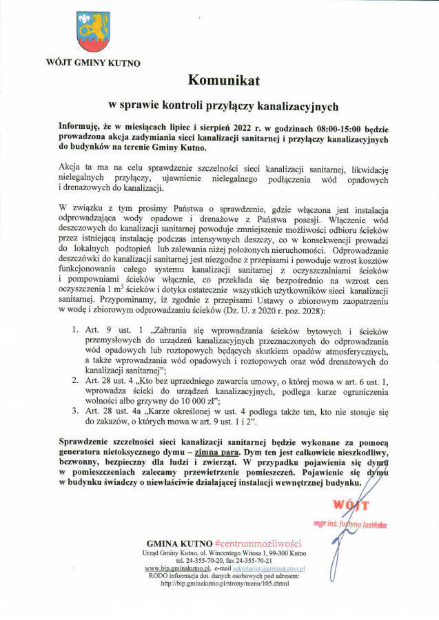 Poniżej komunikat Wójt Gminy Kutno Justyny Jasińskiej w sprawie kontrolo przyłączy kanalizacyjnych.