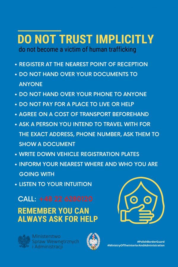 Aktualna sytuacja na granicy polsko-ukraińskiej daje możliwość uaktywnienia się różnego rodzaju grupom przestępczym dążącym do osiągnięcia szybkiego zysku poprzez wykorzystanie dramatycznego położenia osób uciekających przed agresją militarną i katastrofą humanitarną. Tło wojenne oraz przemieszczanie się dużych grup uchodźców wymaga szczególnego zwrócenia uwagi na problematykę przestępstw oraz przeciwdziałania postawom patologicznym czy niegodziwemu traktowaniu ludzi. W obliczu tych szczególnych zagrożeń należy skupić się przede wszystkim na grupie dzieci i kobiet mogących stosunkowo łatwo stać ofiarami przestępstwa handlu ludźmi.