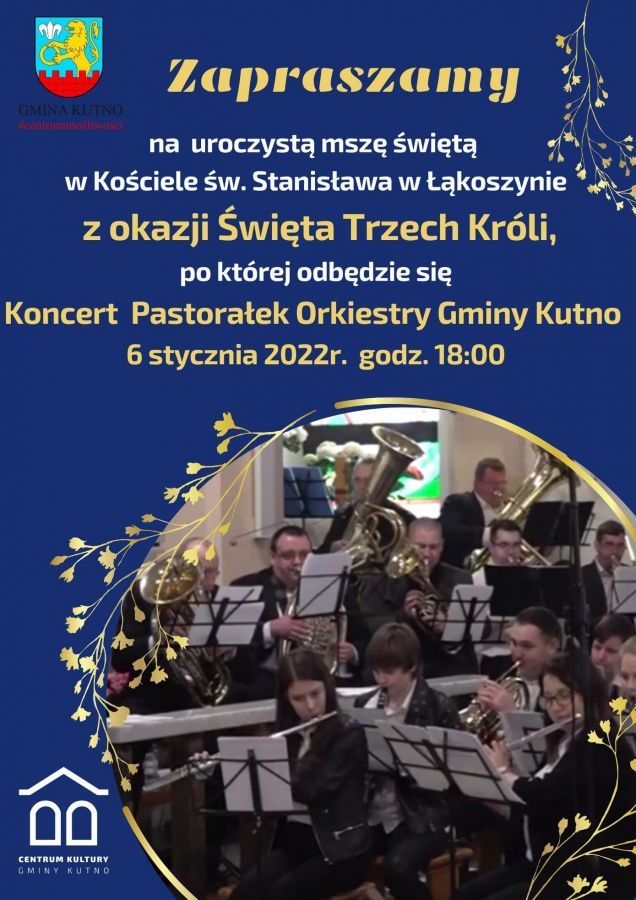 Zapraszamy na Koncert Pastorałek Orkiestry Gminy Kutno.Koncert odbędzie się 6 stycznia 2022r. o godzinie 18:00 po mszy z okazji Święta Trzech Króli w Kościele św. Stanisława w Łąkoszynie