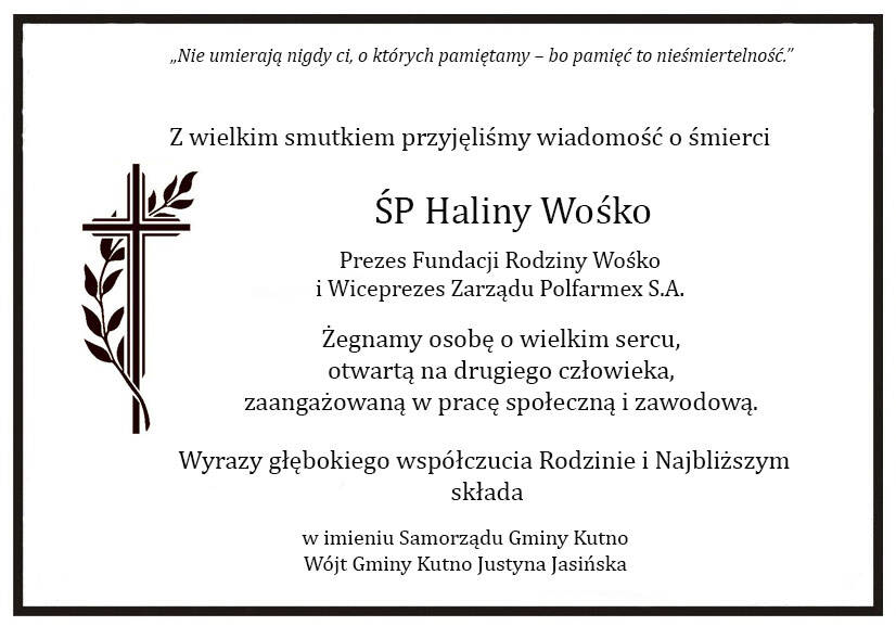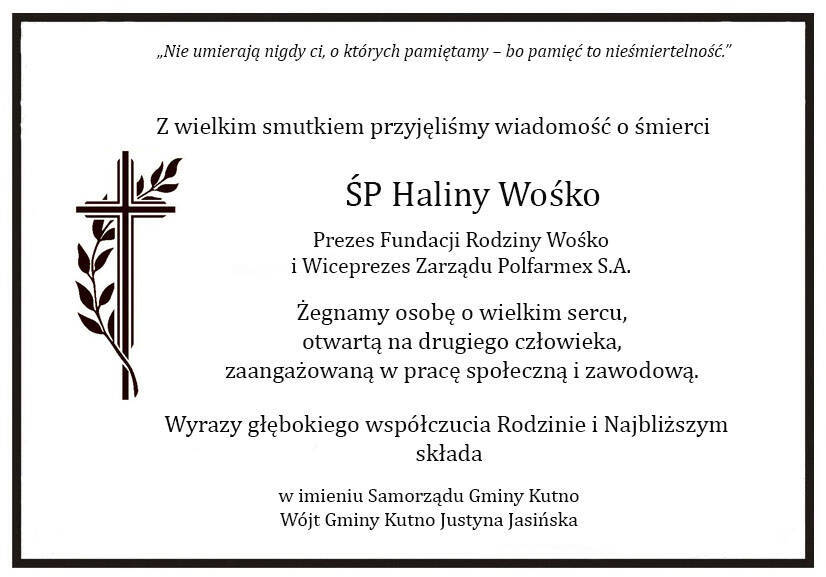Kondolencje dla najbliższych śp. Haliny Wośko od od Wójt Gminy Kutno Justyny Jasińskiej i Samorządu Gminy Kutno