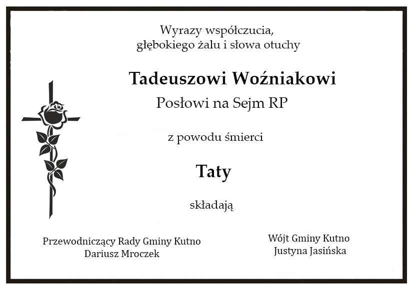 Kondolencje dla Posła Tadeusza Woźniaka od Wójt Gminy Kutno Justyny Jasińskiej i Przewodniczącego Rady gminy Dariusza Mroczka