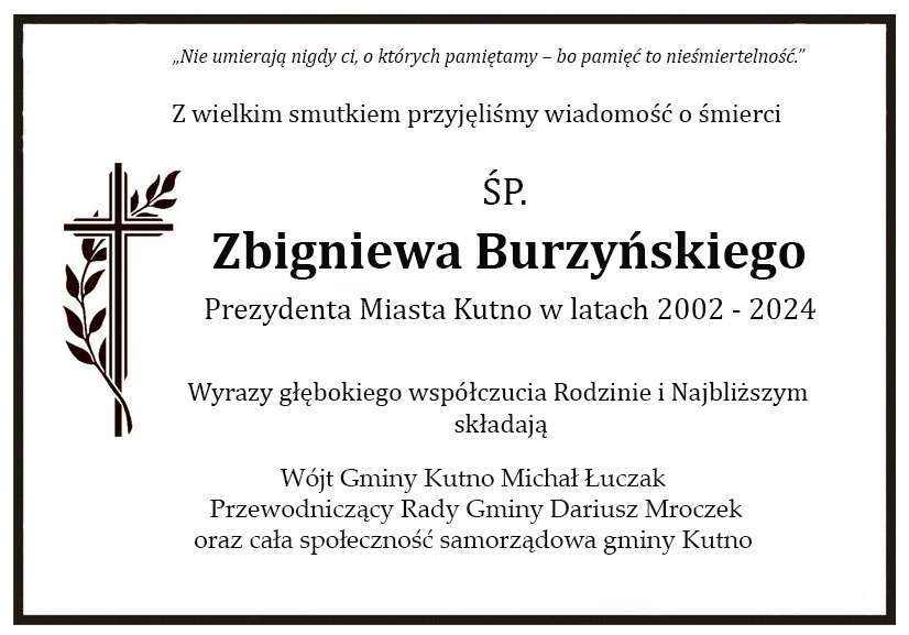 Kondolencje dla najbliższych ŚP.  Zbigniewa Burzyńskiego od Wójta Gminy Kutno Michała Łuczaka i Przewodniczącego Rady Gminy Dariusza Mroczka.