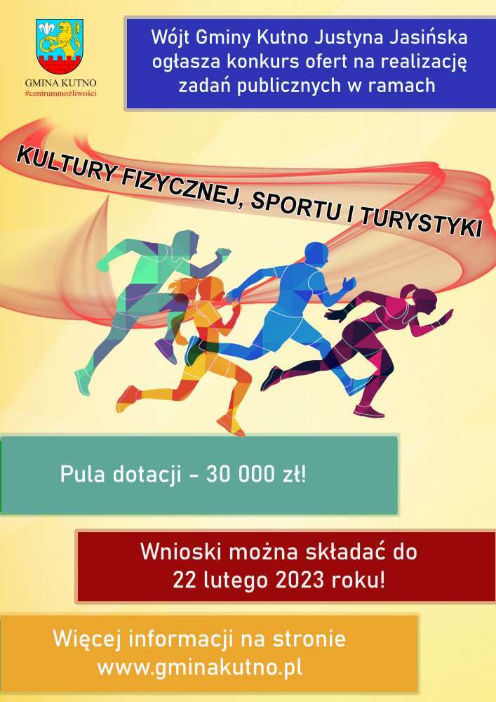 Wójt Gminy Kutno Justyna Jasińska zaprasza do składania ofert na realizację zadań publicznych z obszaru kultury fizycznej, sportu i turystyki. W zakresie wspierania i upowszechnienia kultury fizycznej, sportu i turystyki. Można realizować jedno z poniższych działań: