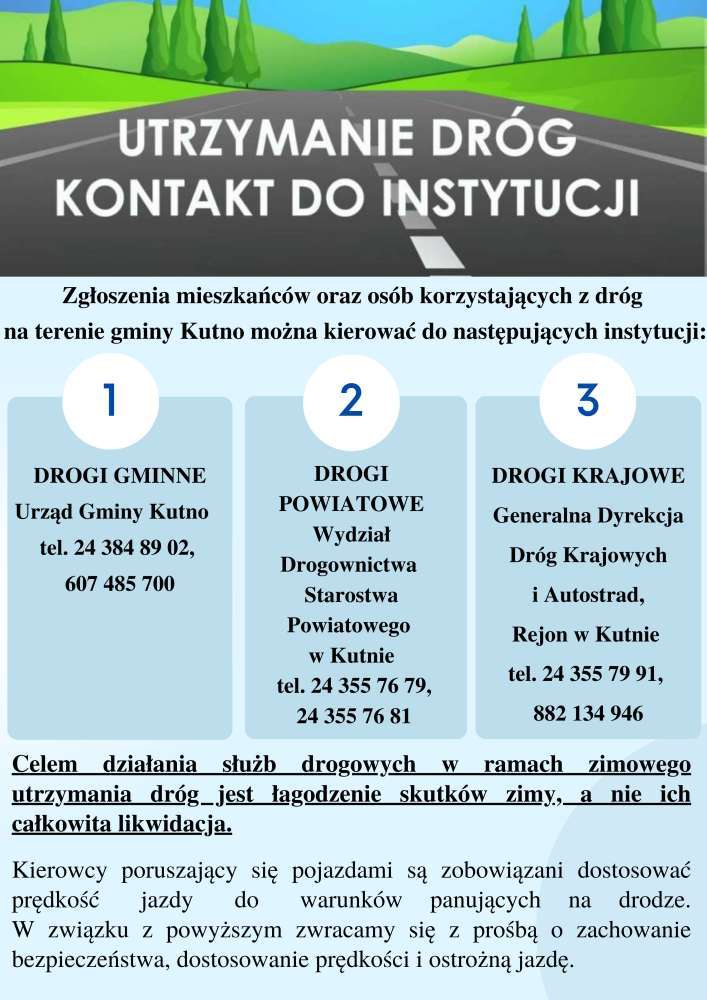Informujemy, że zgłoszenia mieszkańców oraz osób korzystających z dróg na terenie gminy Kutno można kierować do następujących instytucji:
