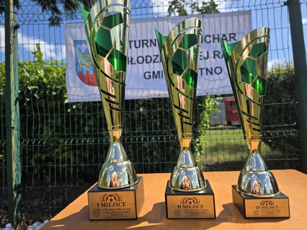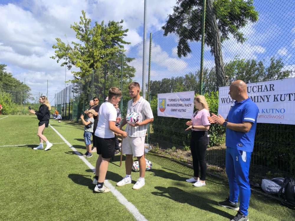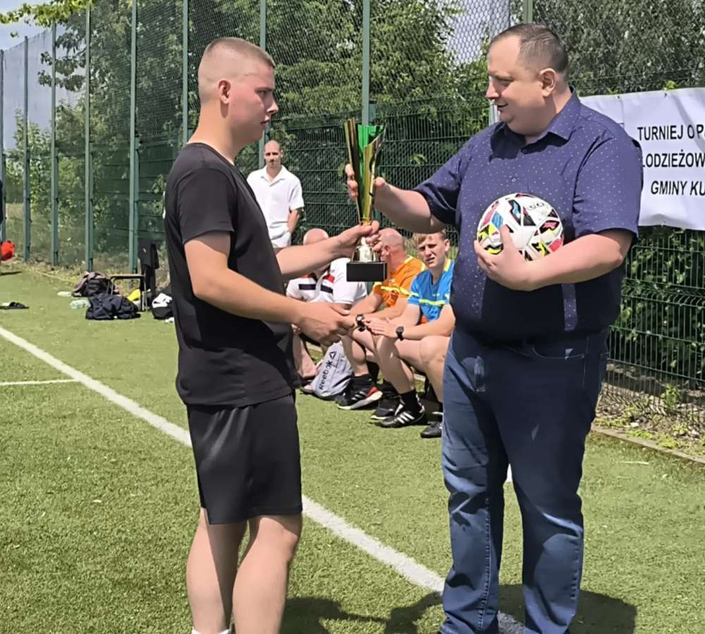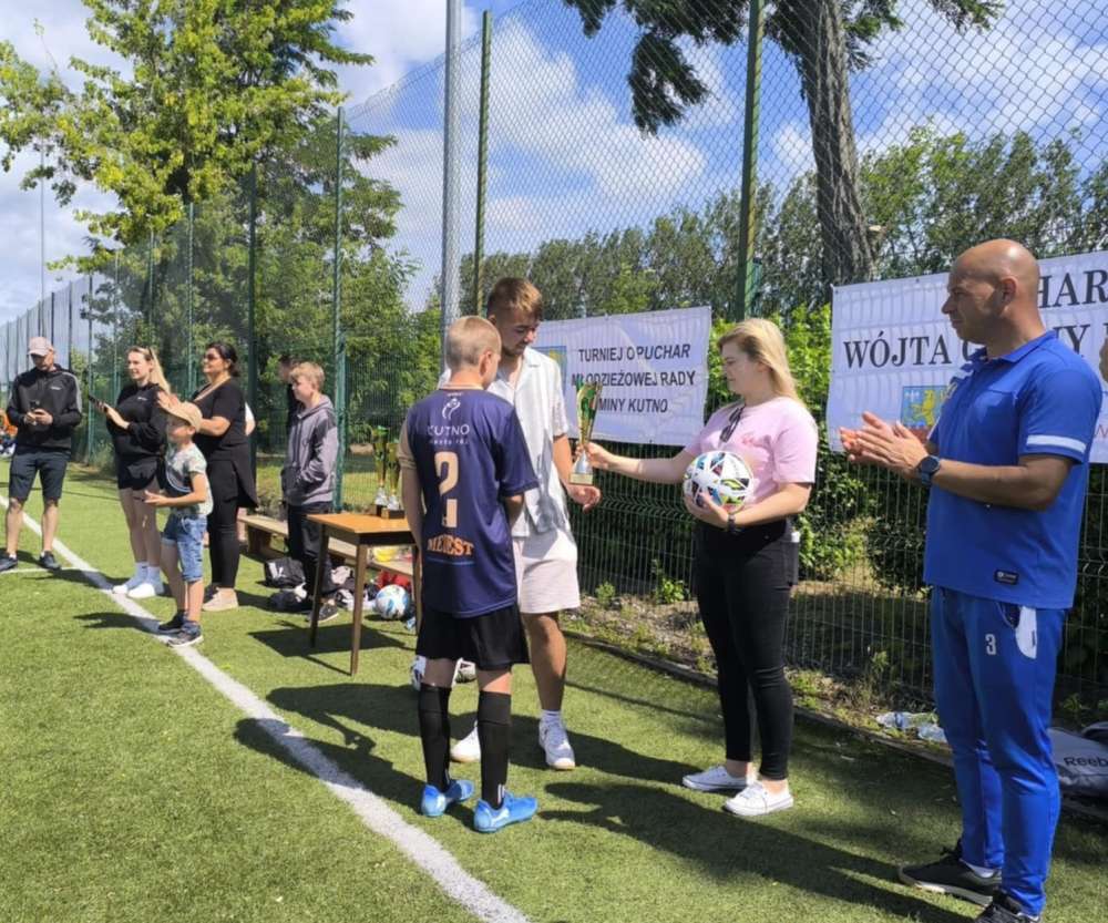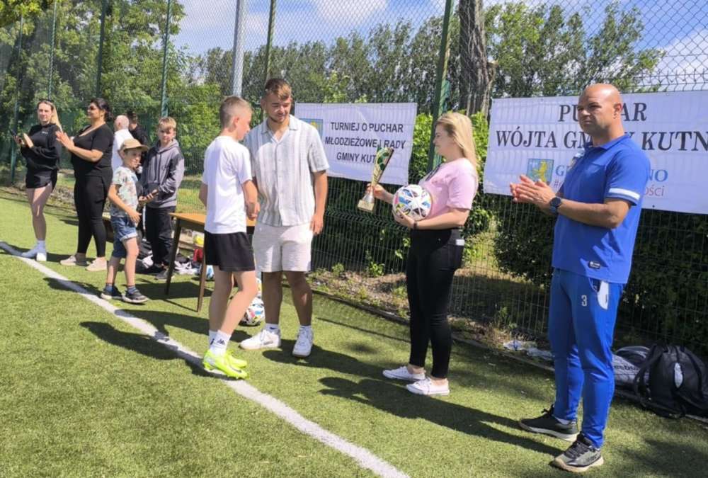 Młodzi piłkarze odebrali nagrody i puchary od wiceprzewodniczącego młodzieżowej Rady Gminy Kutno Szymona Podlasina.