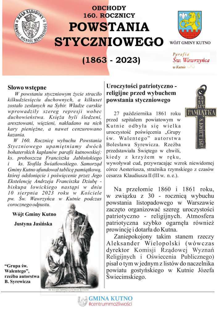 Już dzisiaj w kościele pw. św. Wawrzyńca w Kutnie odbędzie się msza święta celebrowana przez Biskupa Łowickiego Andrzeja Franciszka Dziubę i odsłonięcie pamiątkowej tablicy. Po mszy zapraszamy na koncert w wykonaniu Anny Jeremus - Lewandowskiej. Wydarzenie jest organizowane w ramach Gminnych obchodów 160. rocznicy Powstania Styczniowego.