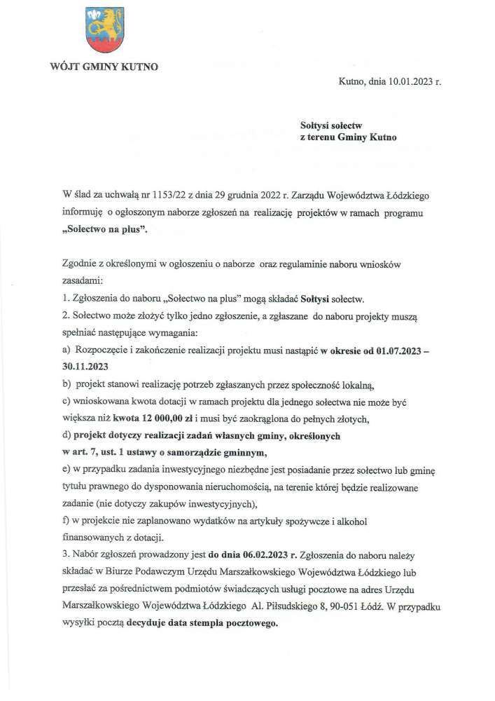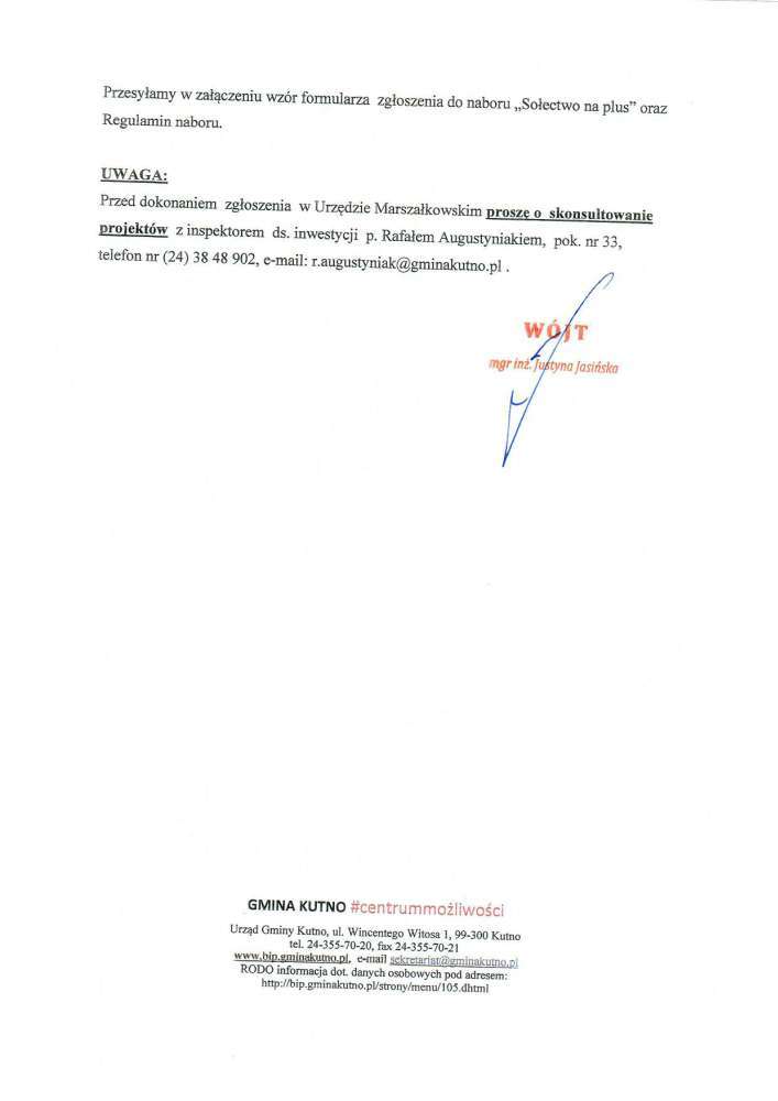 Wójt Gminy Kutno Justyna Jasińska informuje o ogłoszonym naborze zgłoszeń na realizację projektów w ramach programu „Sołectwo na plus".