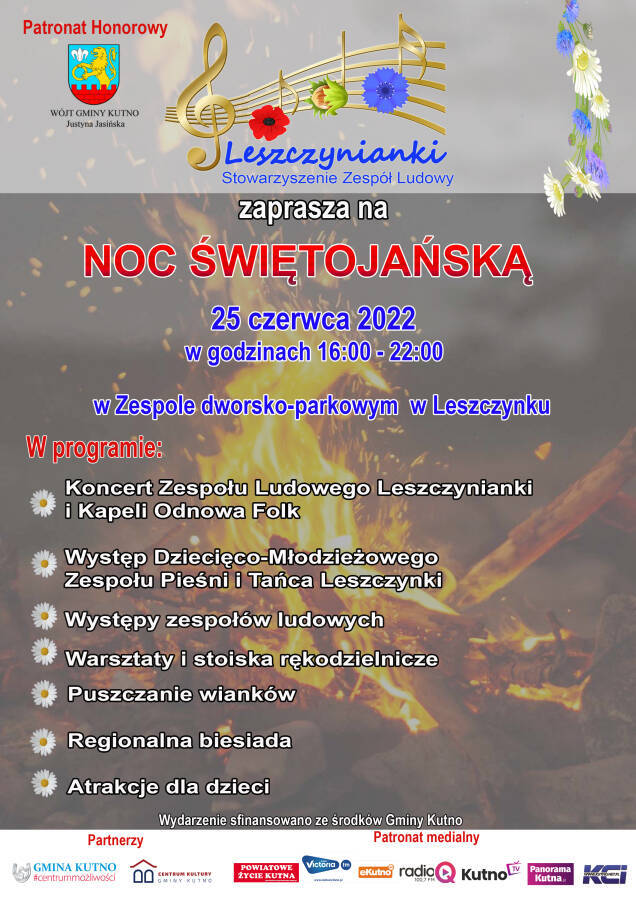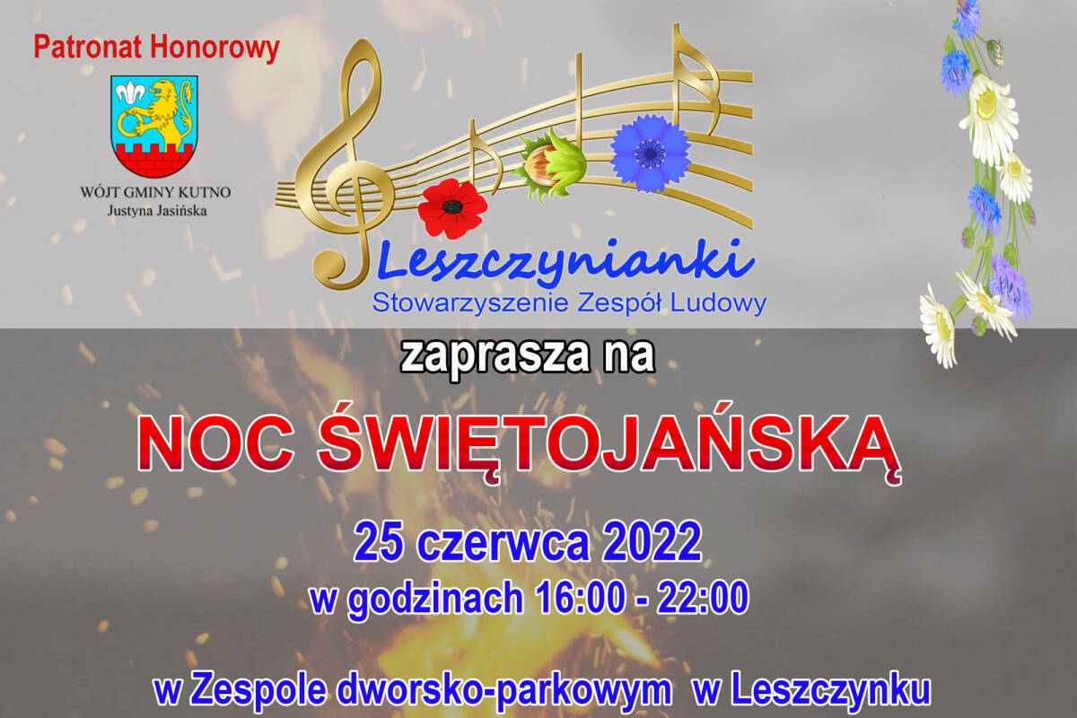 W imieniu Stowarzyszenia Zespół Ludowy Leszczynianki zapraszamy na wyjątkowe obchody Nocy Świętojańskiej, które odbędą się w Zespole dworsko-parkowym w Leszczynku już 25 czerwca. Wydarzenie jest objęte patronatem honorowym Wójt Gminy Kutno Justyny Jasińskiej.
