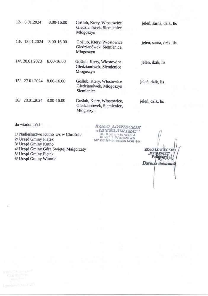 Poniżej treść obwieszczenia Wójt Gminy Kutno dotyczącego terminów rozpoczęcia i zakończenia i miejsc polowań Koła Łowieckiego Myśliwiec