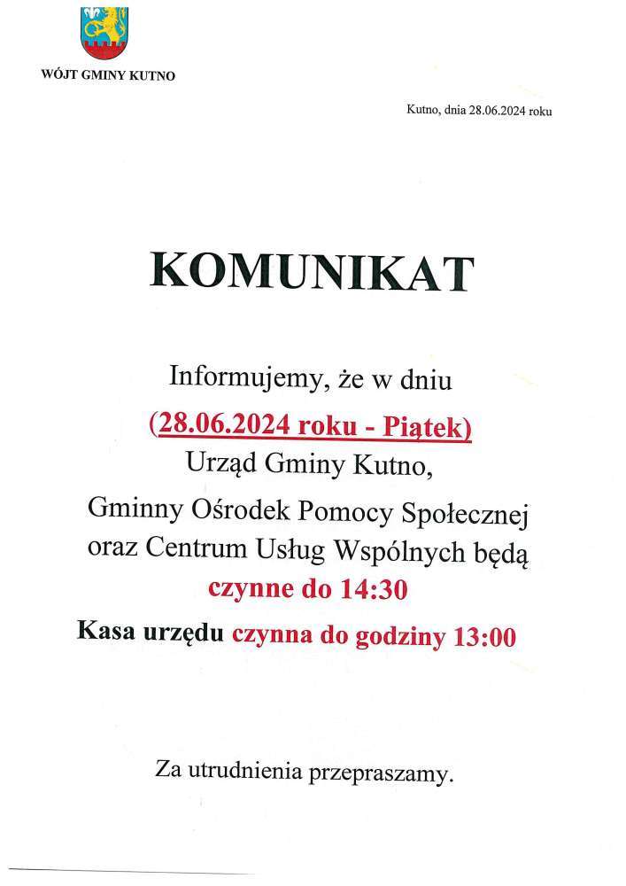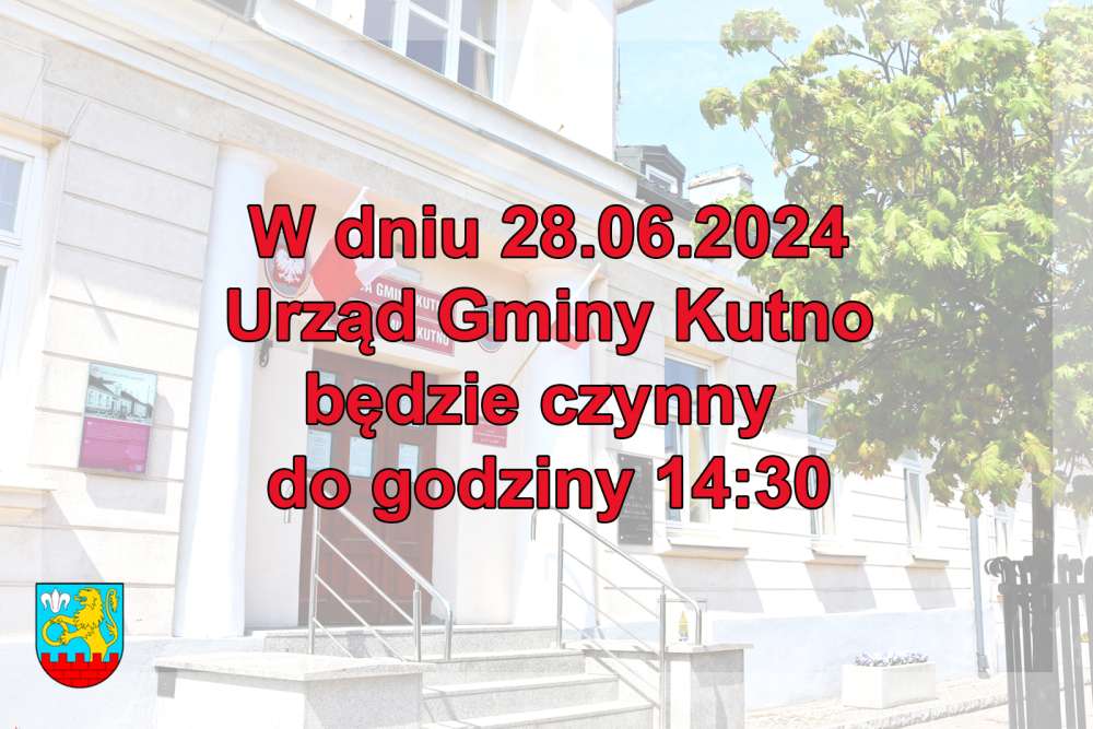 Informujemy, że w dniu 28.06.2024 roku Urząd Gminy Kutno, Gminny Ośrodek Pomocy Społecznej i Centrum Usług Wspólnych będą czynne w godzinach 7:30 -14:30. Kasa urzędu będzie otwarta do godziny 13:00.