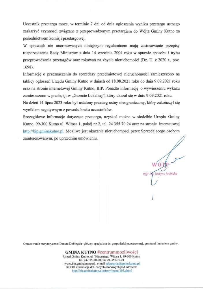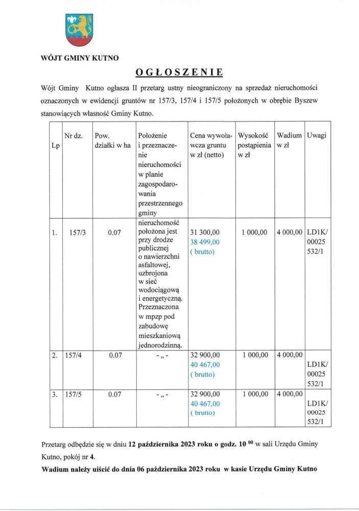 Wójt Gminy Kutno Justyna Jasińska ogłasza II przetarg ustny nieograniczony na sprzedaż nieruchomości w Byszewie. Poniżej treść ogłoszenia