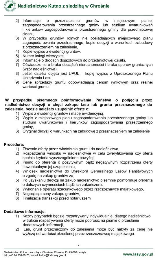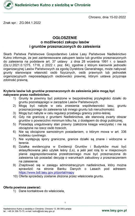 Nadleśnictwo Kutno informuje o możliwości zakupu lasów i gruntów przeznaczonych do zalesienie.
