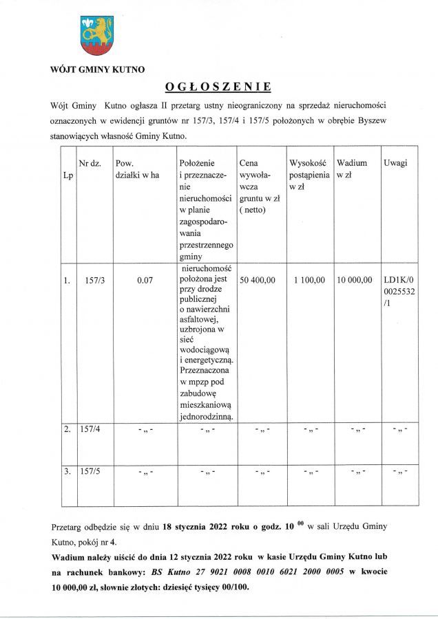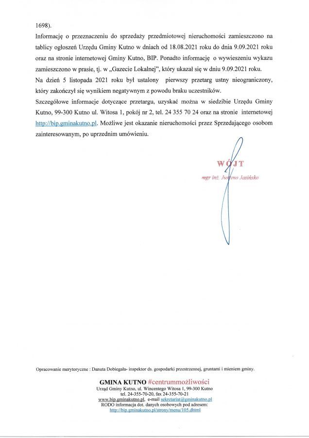 Zapraszamy do zapoznania się z ogłoszeniem Wójt Gminy Kutno Justyny Jasińskiej dot. przetargu na nieruchomości.