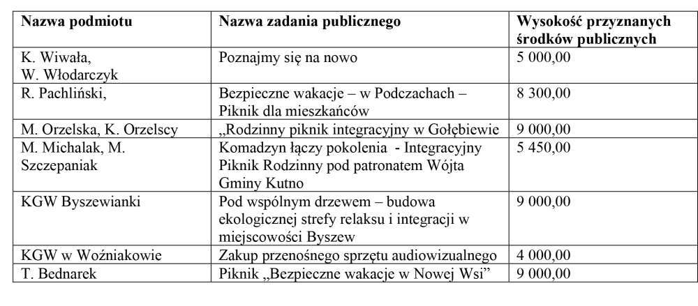 Wójt Gminy Kutno Michał Łuczak informuje, że na otwarte konkursy ofert na realizację zadań publicznych w 2026 roku z zakresów: kultury, kultury fizycznej, sportu i turystyki, ochrony zdrowia i ekologii oraz zadań realizowanych w ramach inicjatywy lokalnej wpłynęło łącznie 20 wnioski, z czego 16 otrzymało dofinansowanie. Łączna kwota jaką przeznaczono na otwarte konkursy ofert i nabór wniosków w ramach inicjatywę lokalną wynosiła 140 000 zł.