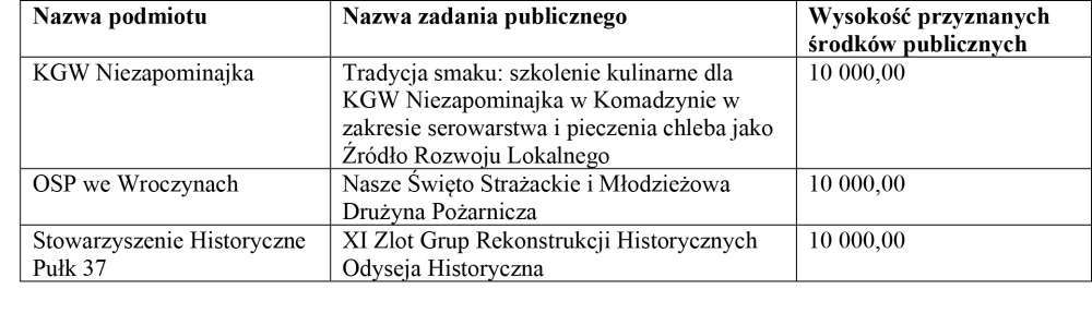 Z dziedziny kultury, sztuki, ochrony dóbr i tradycji wpłynęło łącznie 4 oferty. Pula dotacji z tej dziedziny wynosiła 30 000 zł. Dotację otrzymały następujące organizacje: