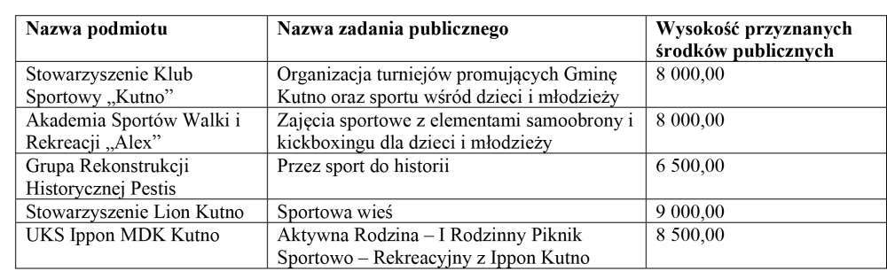 Z dziedziny kultury fizycznej, sportu i turystyki łącznie wpłynęło 6 ofert. Pula dotacji z tej dziedziny wynosiła 40 000 zł. Dotacje otrzymały następujące organizacje pozarządowe: