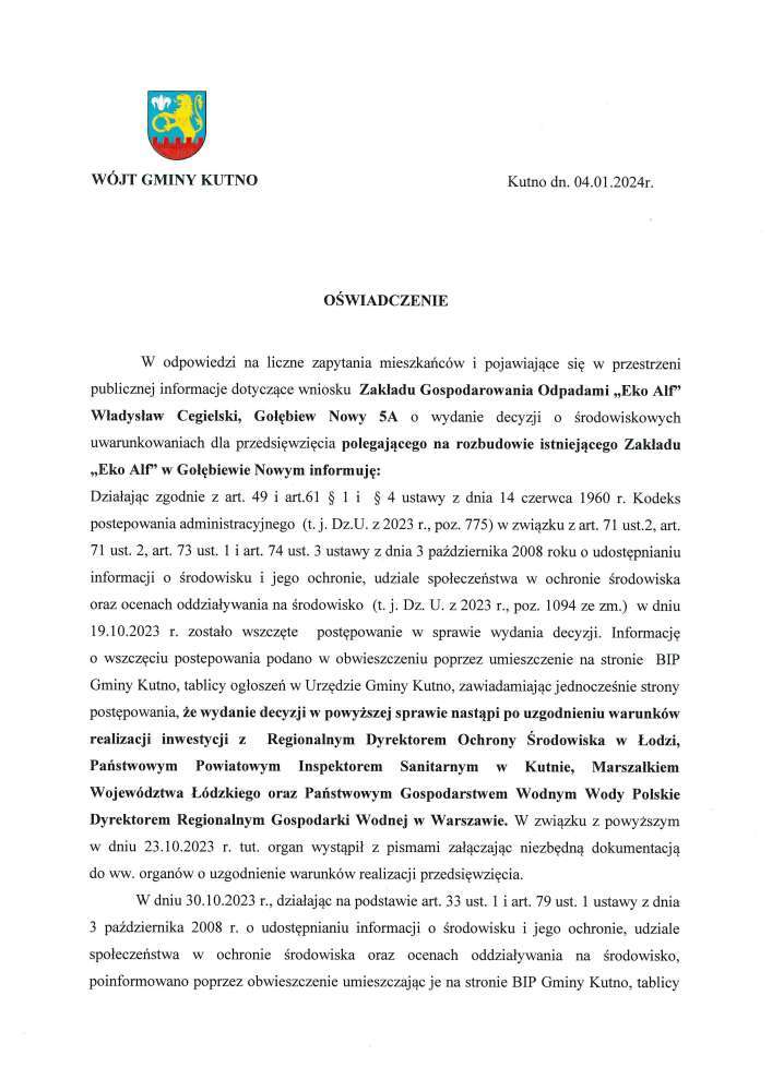 Poniżej treść oświadczenia Wójt Gminy Kutno Justyny Jasińskiej dotyczącego wydania decyzji o środowiskowych uwarunkowaniach dla przedsięwzięcia polegającego n rozbudowie istniejącego Zakładu Gospodarowania Odpadami "Eko Alf"w Gołebiewie Nowym.