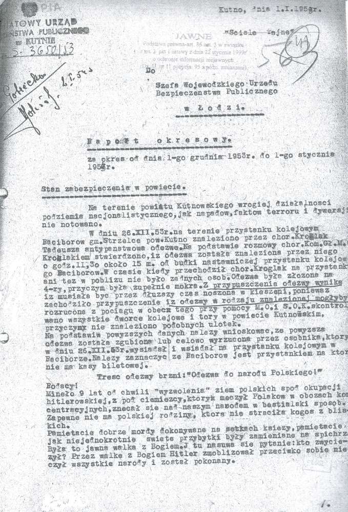 W grudniu 1953 roku. na terenie przystanku kolejowego w Raciborowie, znaleziona została ulotka zatytułowana „Odezwa do Narodu Polskiego", w której pisano: „Polacy! Spójrzmy na obecną rzeczywistość i zastanówmy się, czy ta rzeczywistość nie przypomina nam hitlerowskich czasów. Czy nie jesteśmy okupowani przez reżim kremlowski?…Polacy obudźcie się, śmiało spójrzcie w oczy kremlowskiemu okupantowi! Godzina wyzwolenia nadchodzi! Ale kiedy przyjdzie ten moment, nie zapomnijcie haniebnej zbrodni katyńskiej i walki komuny z Bogiem. Pomścijcie się na to!!! Pomścijcie waszych krewnych zabranych przez NKWD do ciężkich robót i wywiezionych w głąb czerwonej Rosji…". Tekst odezwy napisany był na maszynie i odbity przez kalkę. Poinformowani o znalezisku milicjanci, wspólnie z funkcjonariuszami Służby Ochrony Kolei skontrolowali wszystkie perony i dworce kolejowe na terenie powiatu kutnowskiego w celu ewentualnego wykrycia podobnych ulotek.
