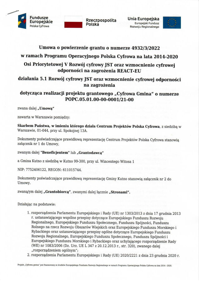 W dniu 13 kwietnia 2022 Wójt Gminy Kutno Justyna Jasińska podpisała umowę o powierzenia grantu w ramach Programu Operacyjnego Polska Cyfrowa. Gminy Kutno w ramach rządowego programu Cyfrowa Gmina otrzymała dofinasowanie na kwotę 262 590 złotych. Celem programu jest wsparcie rozwoju cyfrowego instytucji samorządowych oraz zwiększenie cyberbezpieczeństwa.