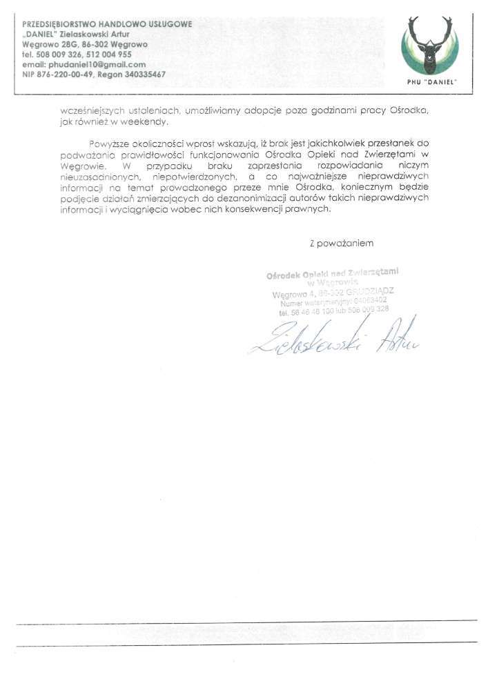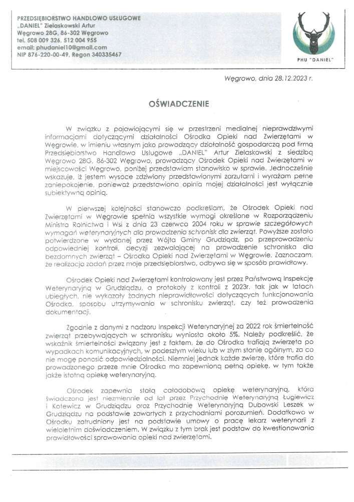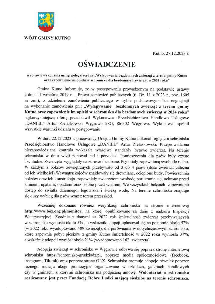 Gmina Kutno informuje, że w dniu 28.12.2023 roku została podpisana umowa na wykonanie usługi polegającej na "Wyłapywaniu bezdomnych zwierząt z terenu gminy Kutno oraz zapewnienie im opieki w schronisku dla bezdomnych zwierząt w 2024 roku" z Przedsiębiorstwem Handlowo Usługowym "DANIEL" Artur Zielaskowski, Węgrowo 28 G, 86-302 Węgrowo.