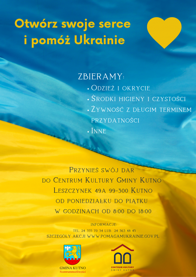 Dary można dostarczać do Centrum Kultury Gminy Kutno od poniedziałku do piątku w godzinach od 8:00 do 18:00.