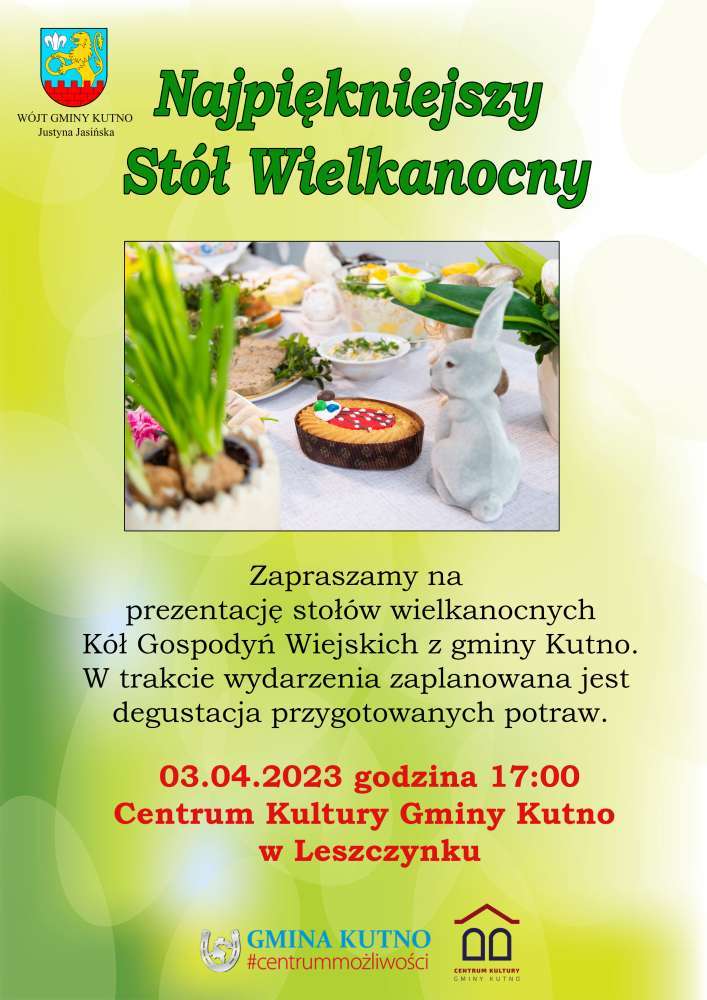 Już 3 kwietnia o godzinie 17:00 zapraszamy do Centrum Kultury Gminy Kutno w Leszczynku na prezentację stołów wielkanocnych połączoną z degustacją.