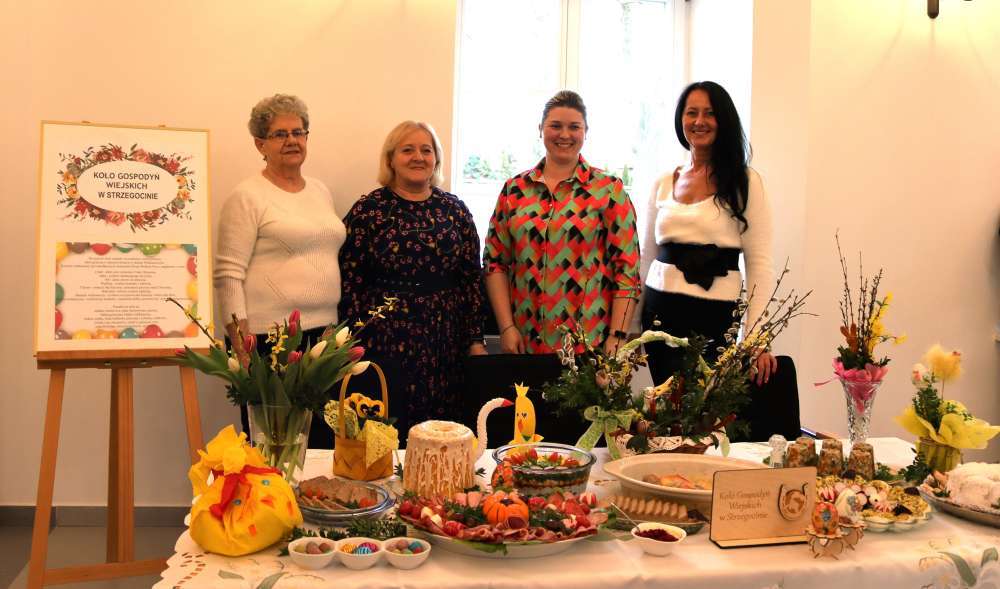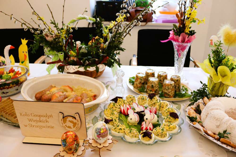 Na stole Koła Gospodyń Wiejskich w Strzegocinie znaleźć mogliśmy koszyk wielkanocny z chlebem, jajkiem, solą, wędliną, chrzanem, bukszpanem, barankiem wielkanocnym i babką wielkanocną. Ponadto przygotowano sałatkę warstwową, jajka faszerowane, pasztet, babkę gotowaną, babkę wielkanocną, bukiet wędlin, białą kiełbaskę pieczoną z cebulką i jabłkiem, ćwikłę i sos chrzanowy, schab w galarecie oraz jajka święcone.