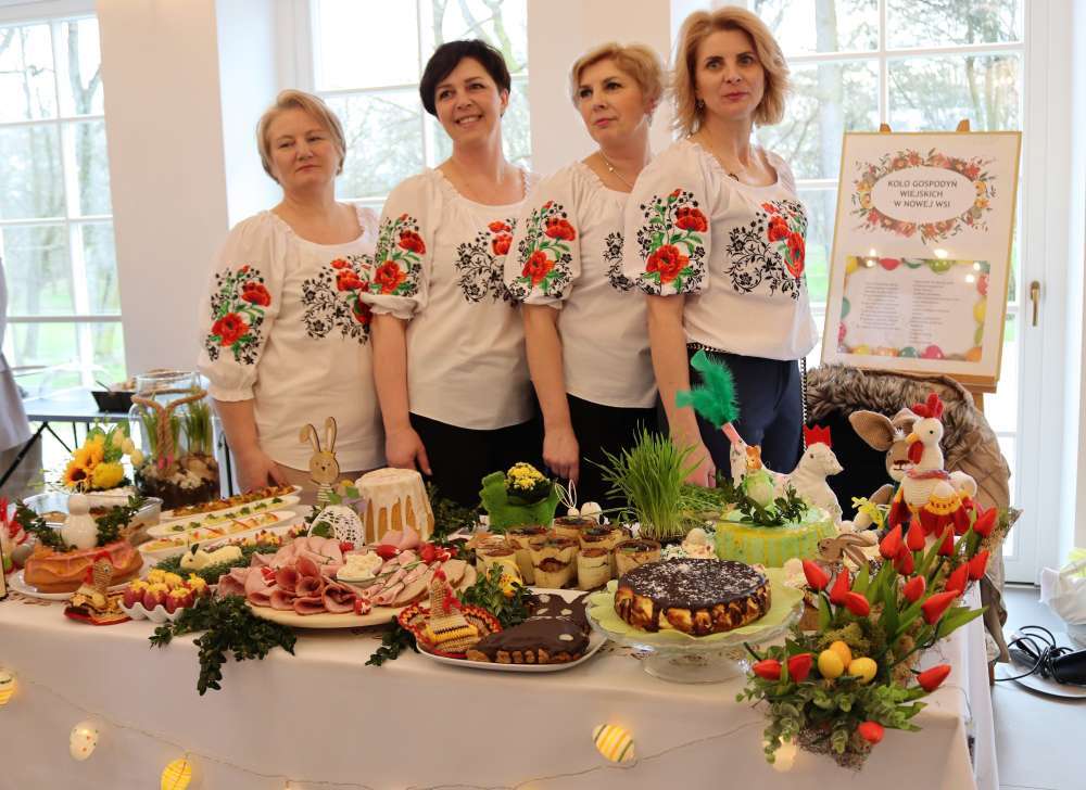 Panie z Koła Gospodyń Wiejskich w Nowej Wsi zaprezentowały na swoim stole biały barszcz, kiełbasę zapiekaną w sosie śmietanowo-chrzanowym, jajka faszerowane, wędliny, szynkę zawijaną z farszem, pasztet, sałatkę z tuńczykiem oraz mnóstwo słodkości: babeczki, mazurka, babkę ucieraną, sernik i babkę gotowaną.