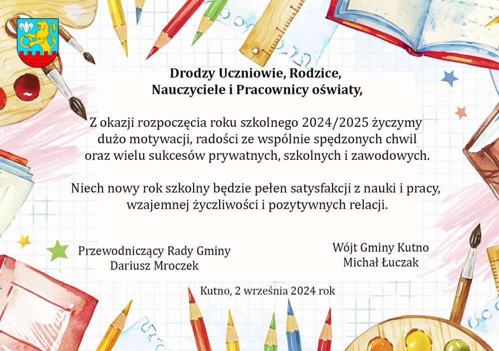 Drodzy Uczniowie, Rodzice, Nauczyciele i Pracownicy oświaty z okazji rozpoczęcia roku szkolnego Wójt Gminy Kutno Michał Łuczak i Przewodniczący Rady Gminy Dariusz Mroczek składają Wam serdeczne życzenia