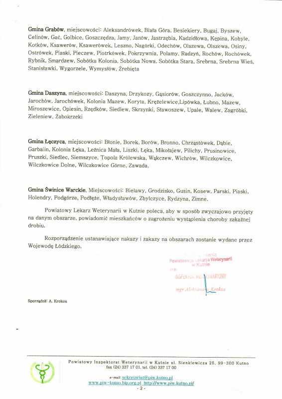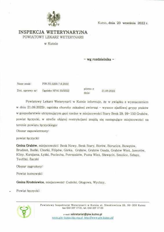 Prosimy o zapoznanie się z komunikatem Powiatowego Lekarza Weterynarii w sprawie wysoce zjadliwej grypy ptaków.