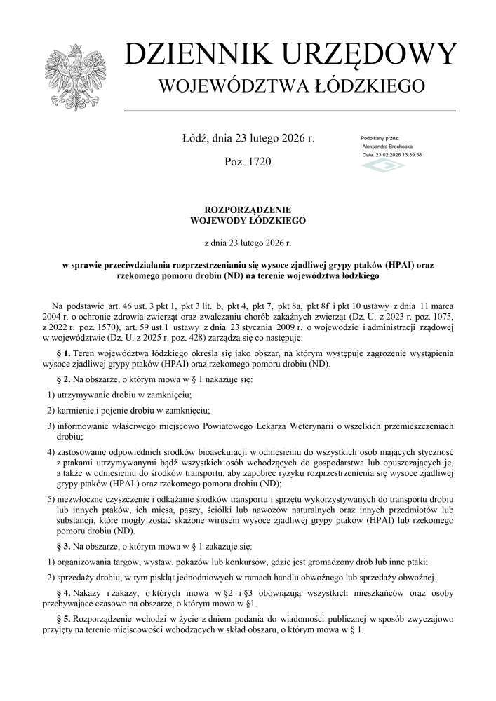 Poniżej treść Rozporządzenia Wojewody Łódzkiego w sprawie przeciwdziałania rozprzestrzenianiu się wysoce zjadliwej grypy ptaków oraz  rzekomego pomoru drobiu na terenie województwa łódzkiego.