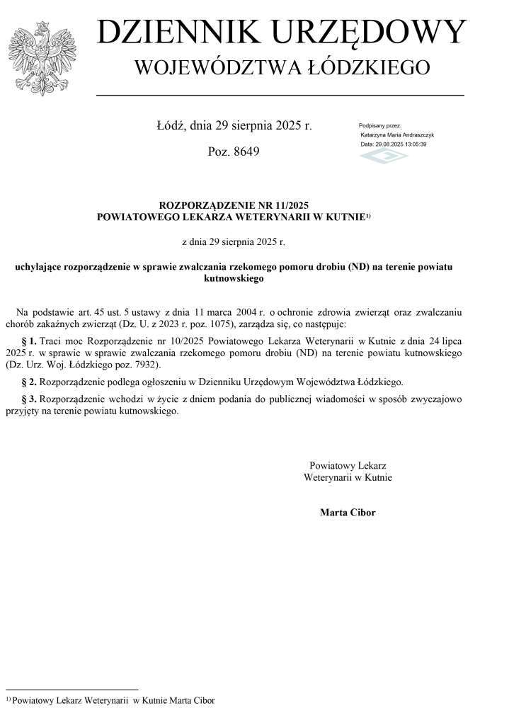 Poniżej treść  Rozporządzenia  nr 11/2025 Powiatowego Lekarza Weterynarii w Kutnie z dnia 29 sierpnia 2025 r.