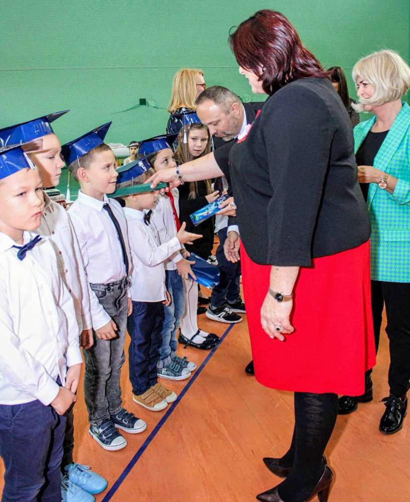 Po zakończeniu części artystycznej Wójt Gminy Kutno Justyna Jasińska dokonała aktu pasowania na ucznia i wręczyła pierwszoklasistom upominki, tym samym witając dzieci w gronie społeczności szkolnej.