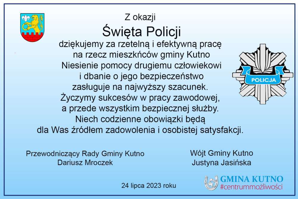 Dzisiaj obchodzimy Święto Policji. Z tej okazji Wójt Gminy Kutno Justyna Jasińska i Przewodniczący Rady Gminy Dariusz Mroczek składają życzenia i podziękowania wszystkim funkcjonariuszom