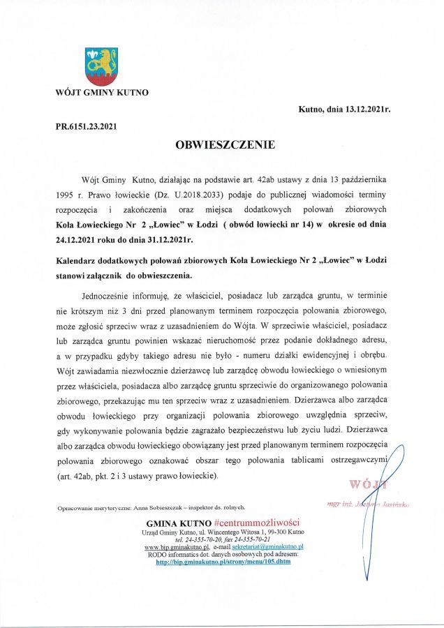 Poniżej obwieszczenie dotyczące terminów polowań Koła Łowieckiego Łowiec