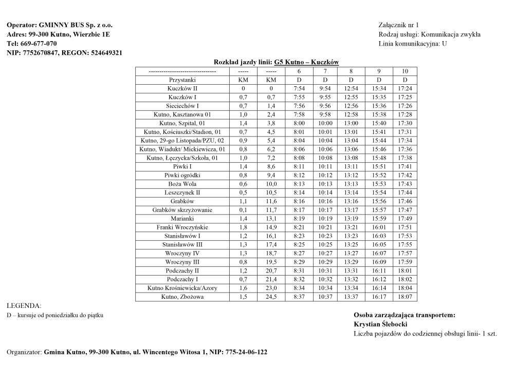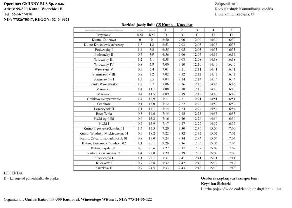 Dodatkowo zostaje wprowadzona linia G5 Kutno – Kuczków, przez miejscowości Podczachy, Wroczyny, Stanisławów, Franki Wroczyńskie, Marianki, Grabków, Leszczynek, Piwki, Sieciechów i Kuczków.
