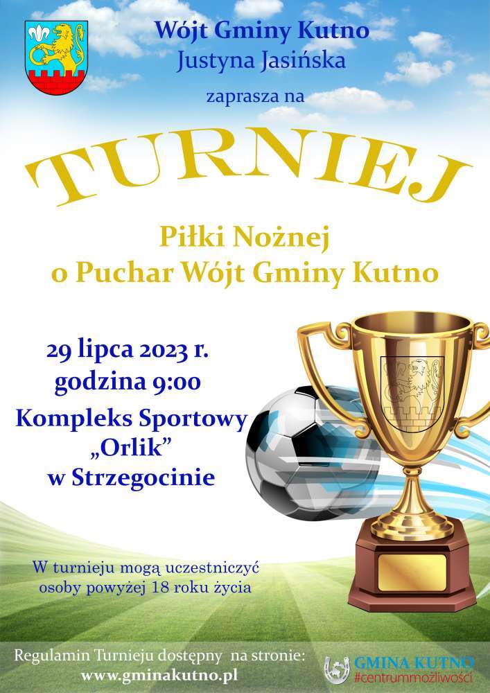 Wszystkich fanów piłki nożnej zapraszamy w najbliższą sobotę do Strzegocina, gdzie odbędzie się Turniej piłki nożnej o Puchar Wójt Gminy Kutno. Rozpoczęcie o godzinie 9:00 . Rywalizować będzie 5 drużyn: