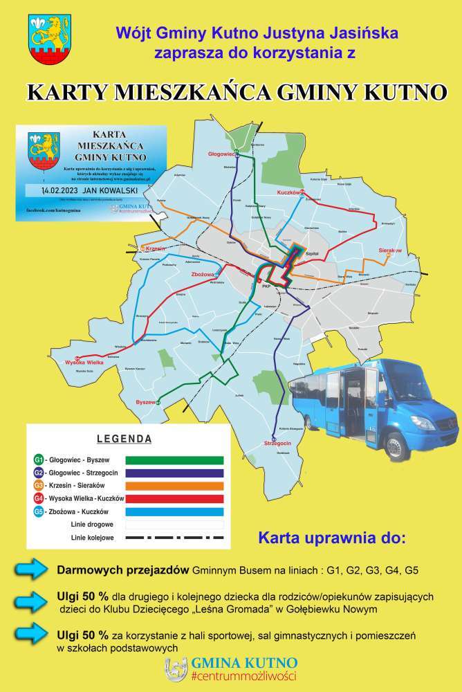 Na terenie gminy Kutno funkcjonuje publiczny transport zbiorowy. Dzięki wprowadzeniu KARTY MIESZKAŃCA GMINY KUTNO mieszkańcy naszej gminy mogą korzystać z bezpłatnego transportu publicznego na następujących liniach komunikacyjnych: