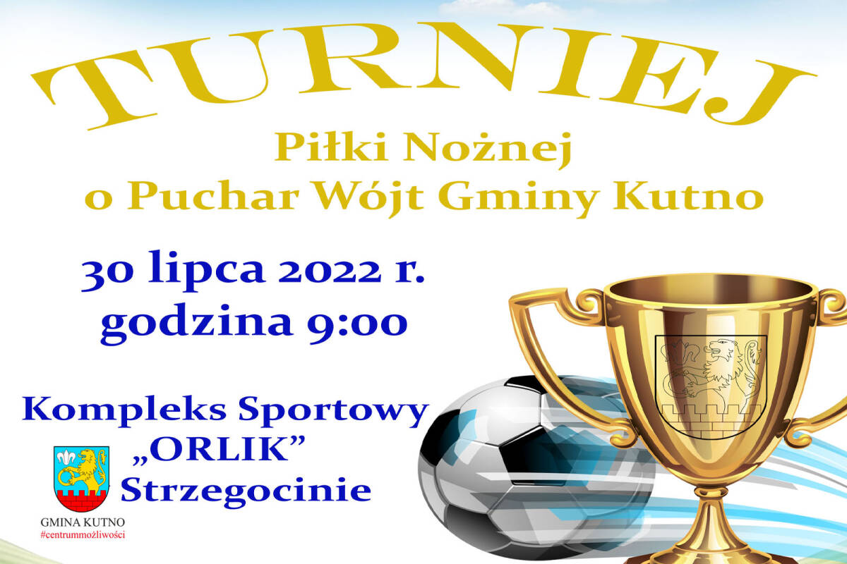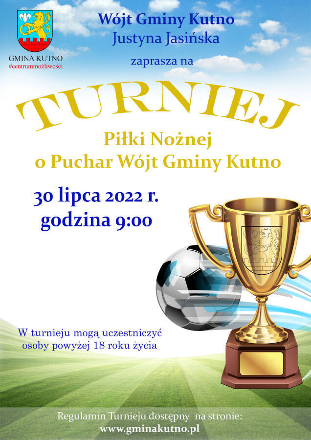 Wójt Gminy Kutno Justyna Jasińska zaprasza do udziału w Turnieju Piłki Nożnej o Puchar Wójt organizowanym w dniu 30 lipca 2022 roku na boisku sportowym „Orlik" w Strzegocinie.